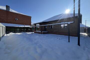 Двор забетонирован, установлены откатные ворота и сделана отмостка. Электричество, газ и центральная вода заведены в дом и подключены.